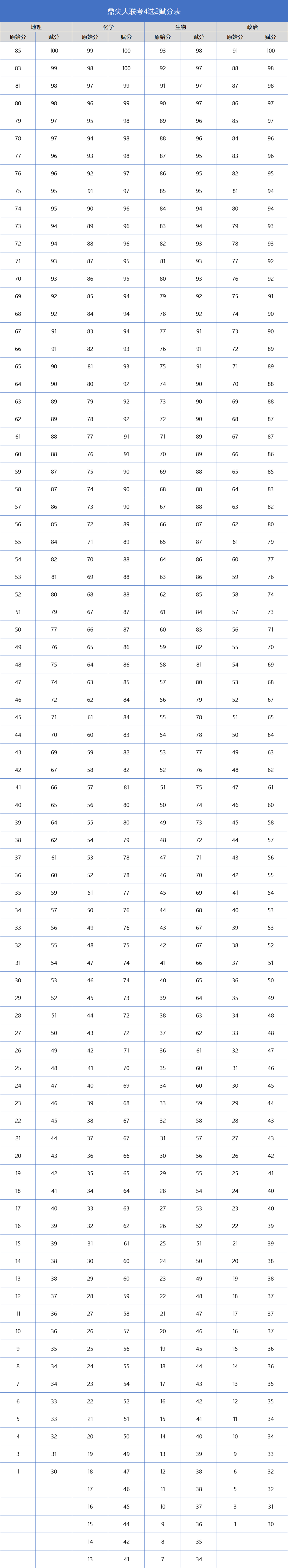 鼎尖大聯(lián)考4選2賦分表如下,大家可以根據(jù)自己的選科情況進(jìn)行對(duì)照參考:
