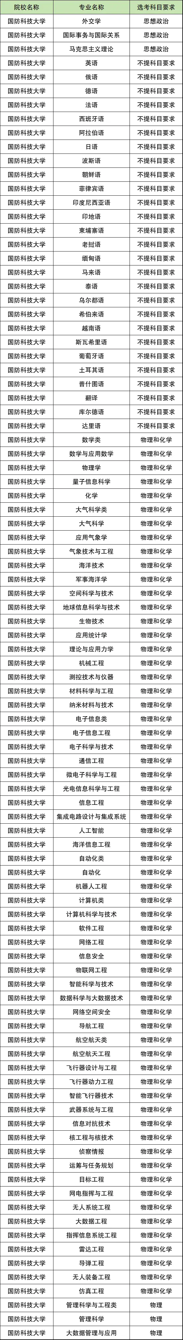 國防科技大學(xué)2026年各專業(yè)選科要求: