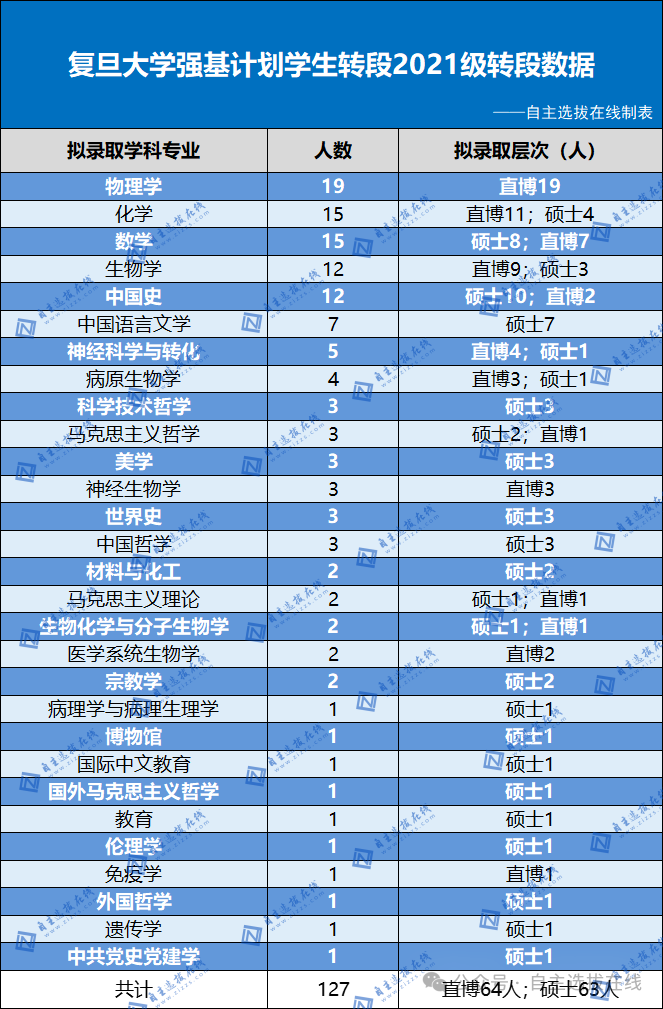 2??復(fù)旦大學(xué)2021級(jí)強(qiáng)基畢業(yè)生轉(zhuǎn)段擬錄取研究生及直博共計(jì)127人,其中直博64人,碩士63人。因復(fù)旦未公布2021年強(qiáng)基錄取人數(shù),轉(zhuǎn)段率無法確定。