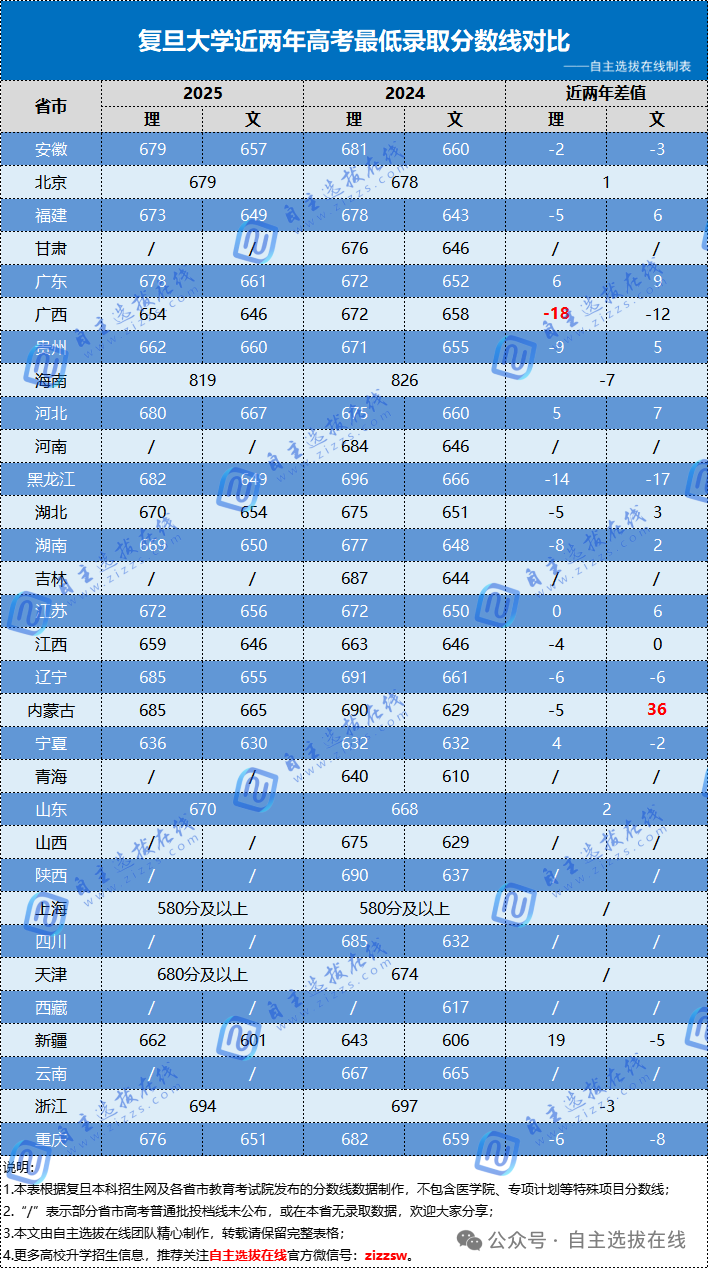 自主選拔在線團(tuán)隊(duì)匯總整理了復(fù)旦大學(xué)近兩年各省統(tǒng)招最低錄取分?jǐn)?shù)線對(duì)比,供考生家長參考。