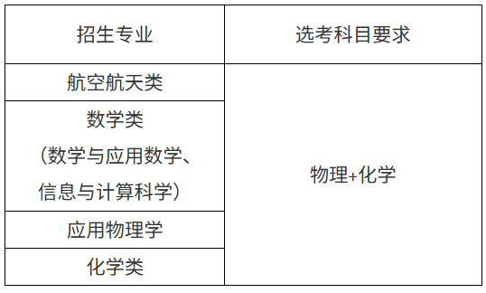 強(qiáng)基計(jì)劃招生專業(yè)包括航空航天類、數(shù)學(xué)類(數(shù)學(xué)與應(yīng)用數(shù)學(xué)、信息與計(jì)算科學(xué))、應(yīng)用物理學(xué)、化學(xué)類。各專業(yè)選考科目要求如下: