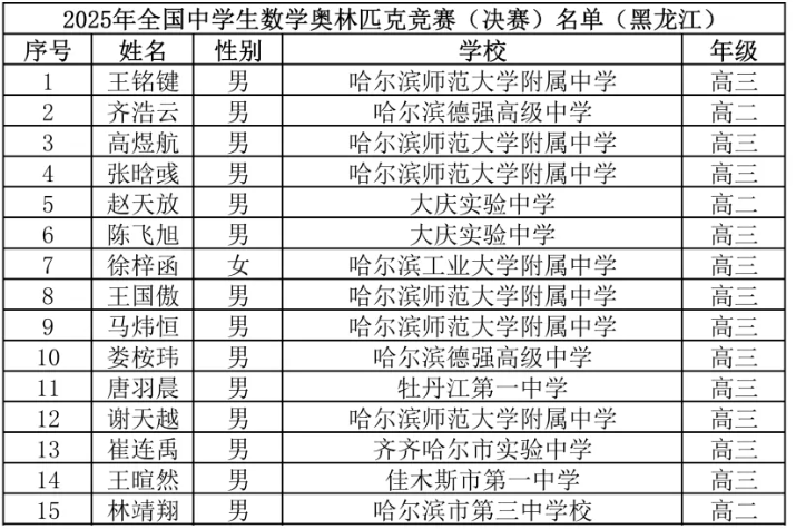 黑龍江2025年數(shù)學(xué)聯(lián)賽省隊獲獎名單