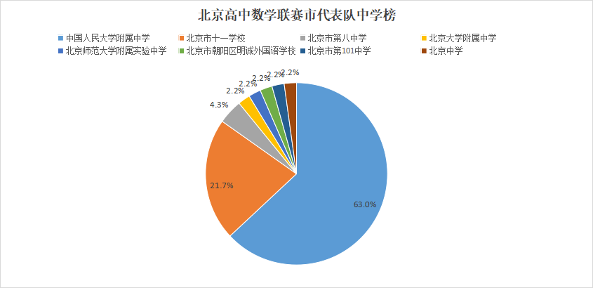 從2025年北京市中學生數(shù)學聯(lián)賽省隊中學榜來看,北京市的數(shù)學競賽格局呈現(xiàn)出“絕對龍頭引領,強者恒強”的鮮明特征。中國人民大學附屬中學以29人的絕對優(yōu)勢占據(jù)統(tǒng)治地位,其占比高達63%,超過了總人數(shù)的六成;北京市十一學校作為第二梯隊,以10人入選、21.7%的占比穩(wěn)固了其領先地位。這兩所學校共同構成了北京市數(shù)學競賽的第一集團,包攬了超過84%的省隊名額,形成了雙雄并立的基本盤。