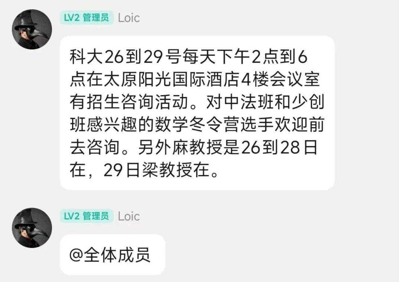 中科大26號到29號每天下午2點到6點在太原陽國際酒店4樓會議室有招生資訊活動。對中法班和少創(chuàng)班感興趣的數(shù)學(xué)冬令營選手歡迎前去咨詢。