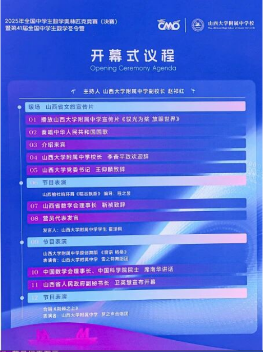 今天是2025第41屆全國(guó)中學(xué)生數(shù)學(xué)冬令營(yíng)(CMO)的第二天。根據(jù)賽事日程安排,開(kāi)幕式于今天早上9:00舉行,山西大學(xué)附屬中學(xué)進(jìn)行了直播。