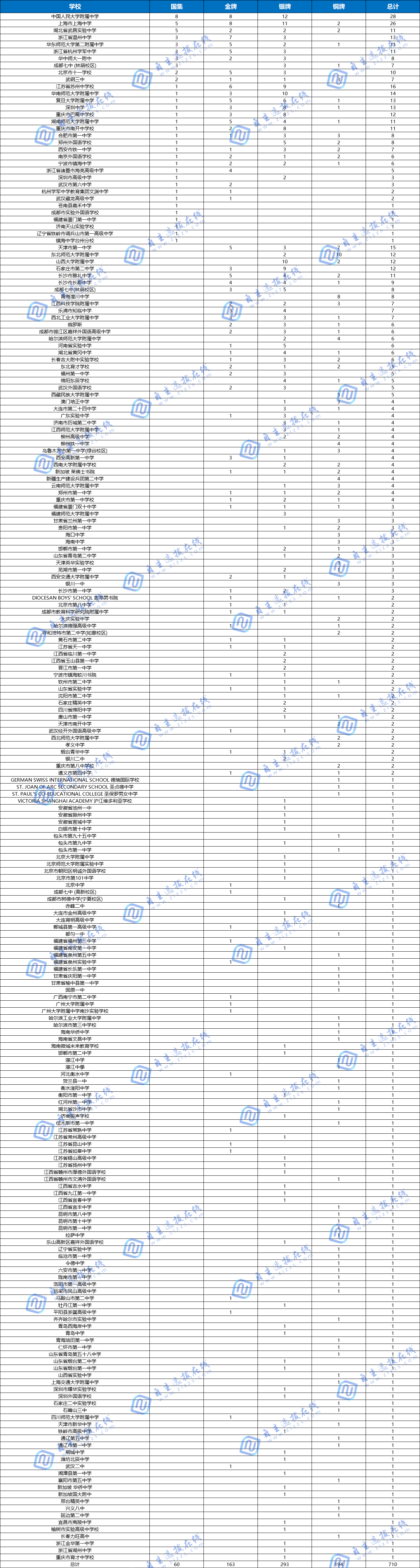金牌總?cè)藬?shù)排名前三的學(xué)校為:中國(guó)人民大學(xué)附屬中學(xué)16人,上海中學(xué)13人,浙江省溫州中學(xué)10人。