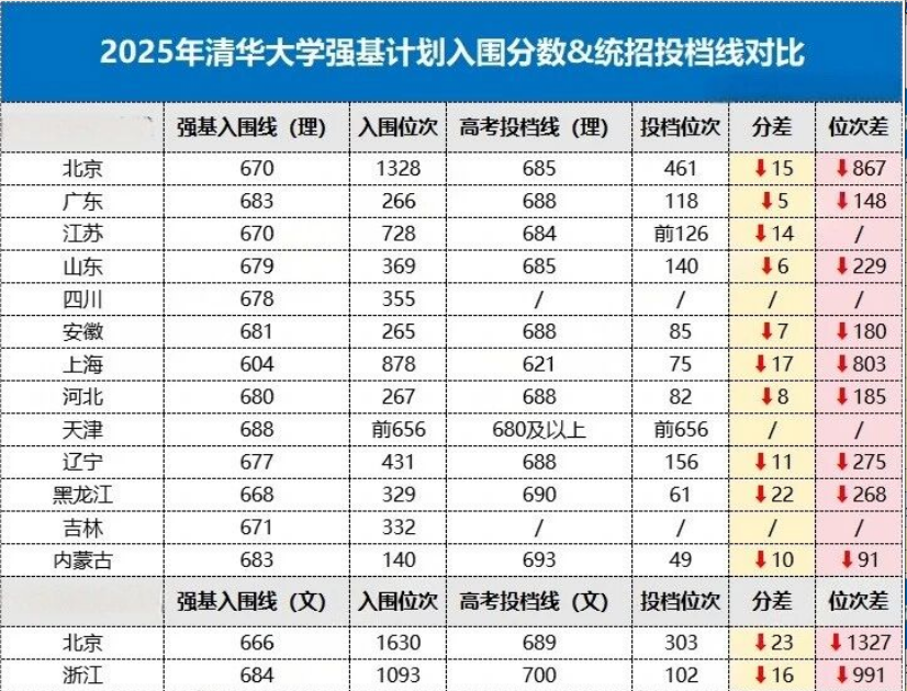 清華、北大強(qiáng)基計劃不僅能提供額外的降分升學(xué)的機(jī)會,在培養(yǎng)轉(zhuǎn)段方面還有本碩博連讀、資源傾斜等優(yōu)惠政策。整理了清華、北大2025年各省入圍分?jǐn)?shù)線及位次,以及對應(yīng)的降分幅度,供考生家長參考: