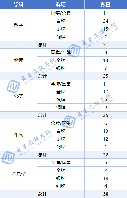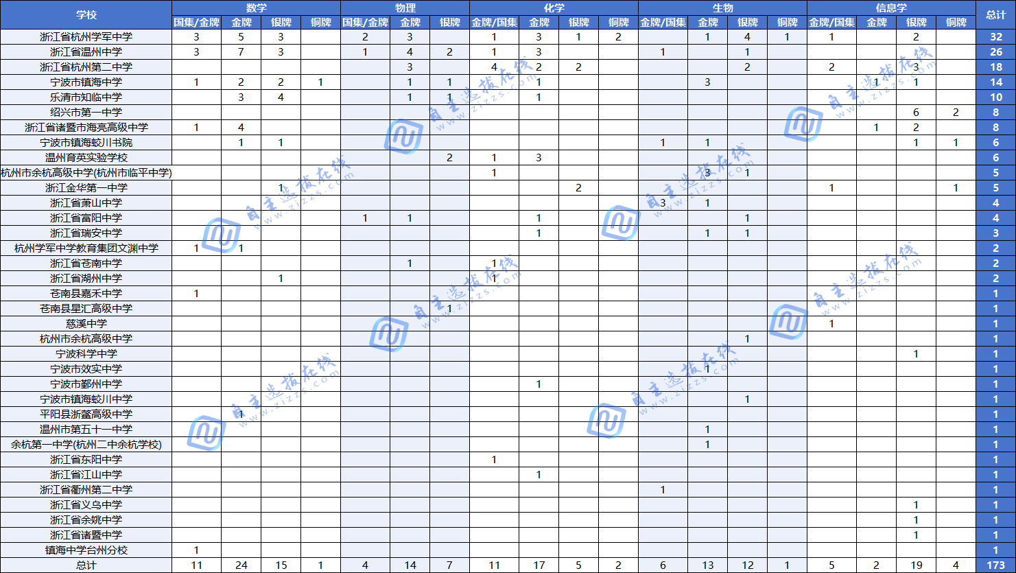 樂清市知臨中學:10人,數(shù)學優(yōu)勢明顯(3金4銀),化學也有獎項。