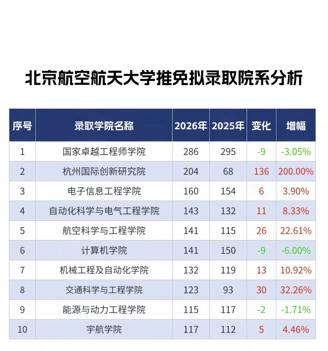 錄取人數(shù)排名前五的學院分別為:國家卓越工程師學院(286人);中法航空學院(204人);電子信息工程學院(160人);自動化科學與電氣工程學院(143人);航空科學與工程學院(141人)。