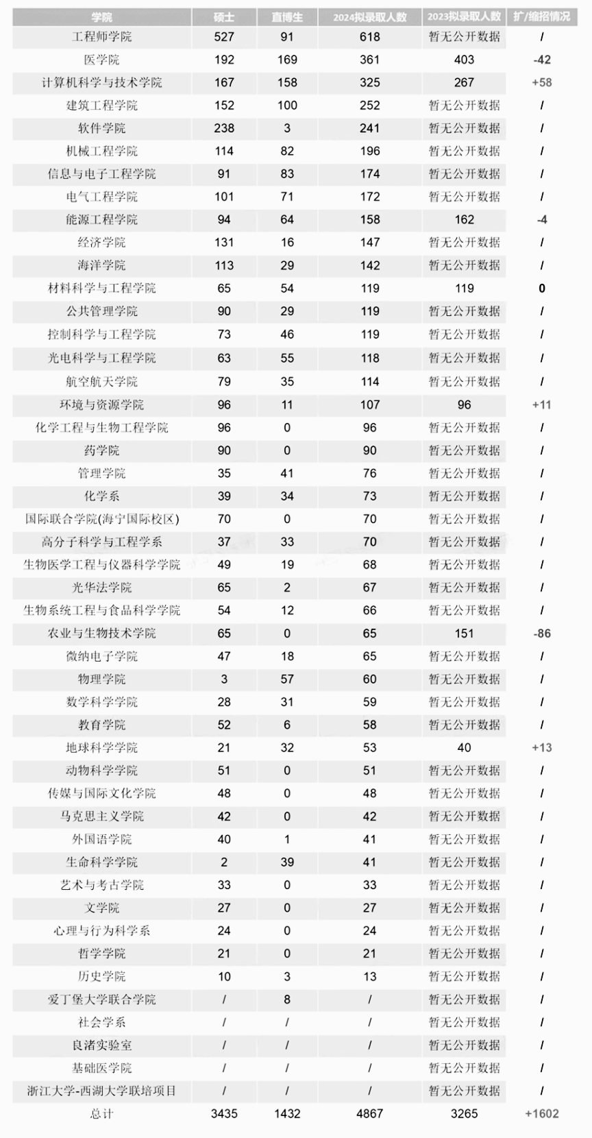 根據(jù)浙江大學(xué)各院系公示的2025屆推免生錄取數(shù)據(jù)統(tǒng)計(jì),浙江大學(xué)2025屆共計(jì)招收推免學(xué)生4867人,其中碩士生3435人、直博生1432人,除了少部分未公布數(shù)據(jù)的院系外,這一數(shù)據(jù)為我們展示了全校的招生情況。