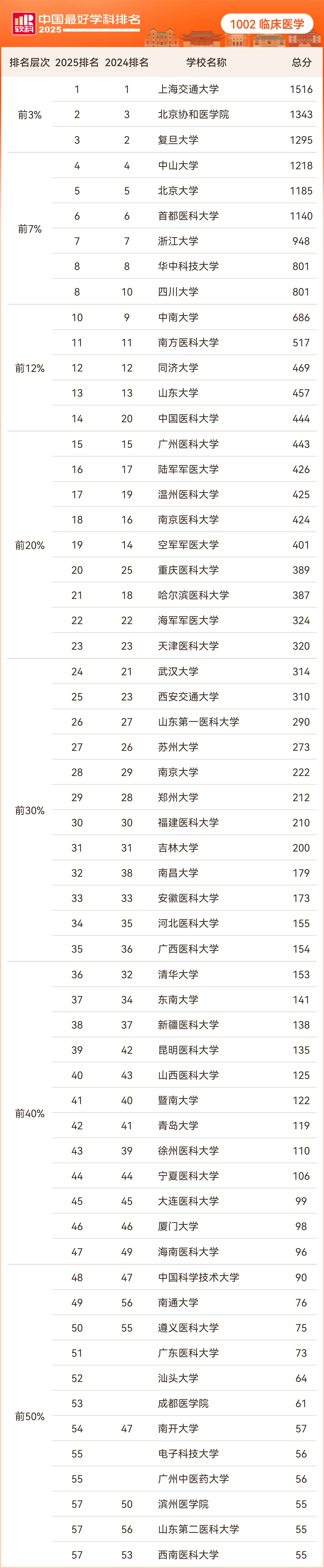 前6名高校與2024年完全一致,但北京協(xié)和醫(yī)學(xué)院與復(fù)旦大學(xué)交換了位次,體現(xiàn)了頂尖院校間持續(xù)的激烈競(jìng)爭(zhēng)。