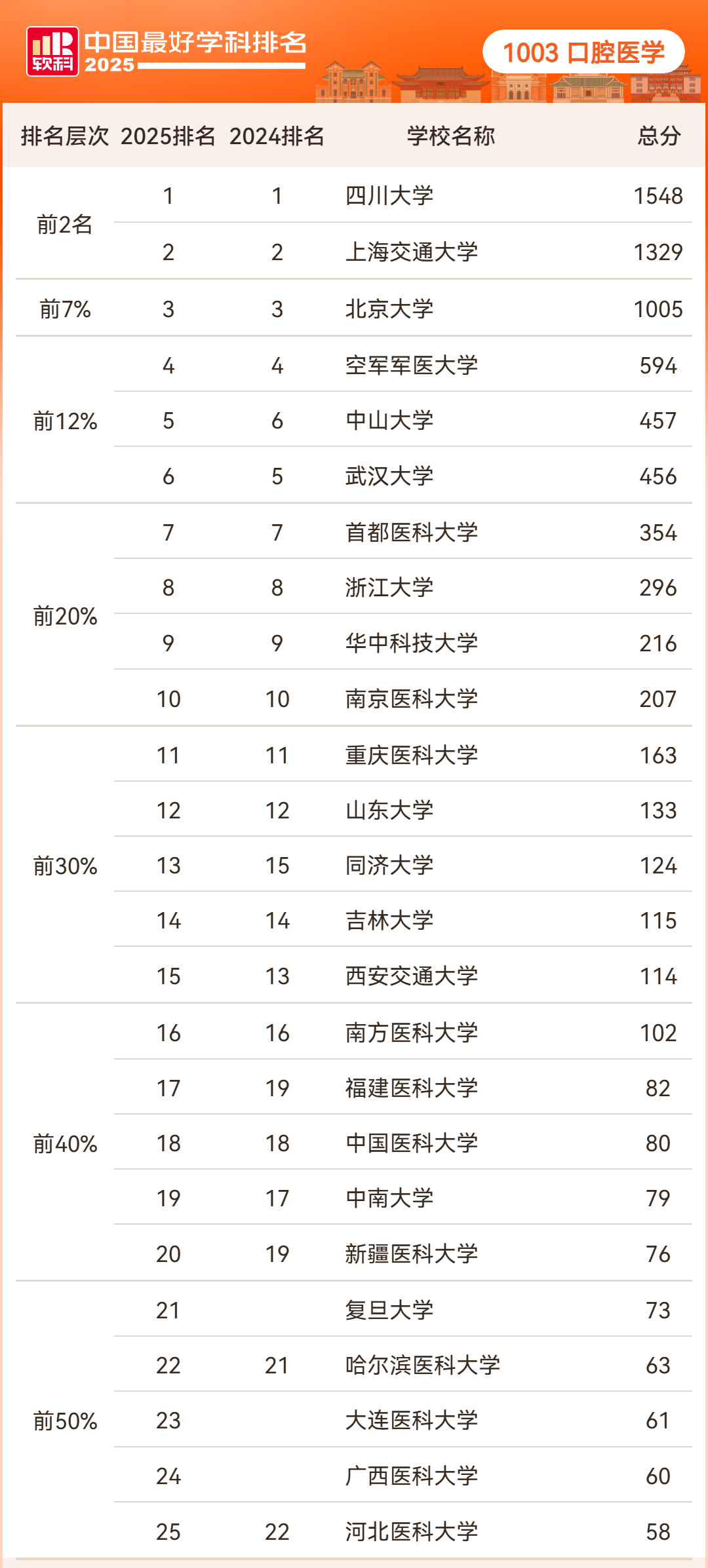 2025年軟科中國(guó)最好學(xué)科排名——口腔醫(yī)學(xué)