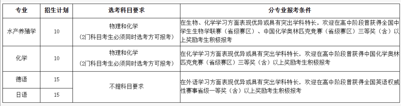 招生專業(yè)包括:水產(chǎn)養(yǎng)殖學(xué)、化學(xué)、德語、日語。