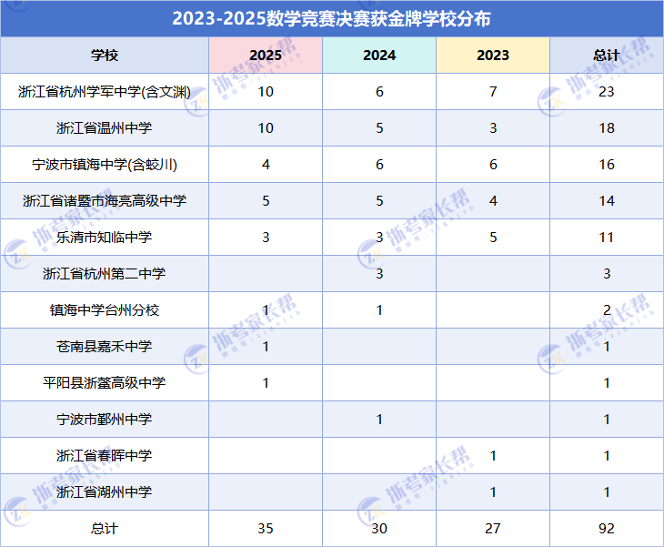 2025年第41屆數(shù)學(xué)競賽已圓滿落下帷幕,恭喜浙江各位獲獎考生!浙江今年共11人入選國家集訓(xùn)隊(duì),保送清北,35人斬獲金牌(含11名國集選手),金牌數(shù)全國第一,15人喜獲銀牌,1人銅牌!今天為大家盤點(diǎn)一下浙江省近三年各中學(xué)數(shù)競獲獎情況,看看浙江哪些中學(xué)在數(shù)學(xué)競賽上更勝一籌,自主選拔在線團(tuán)隊(duì)為大家整理了相關(guān)內(nèi)容,一起來看。
